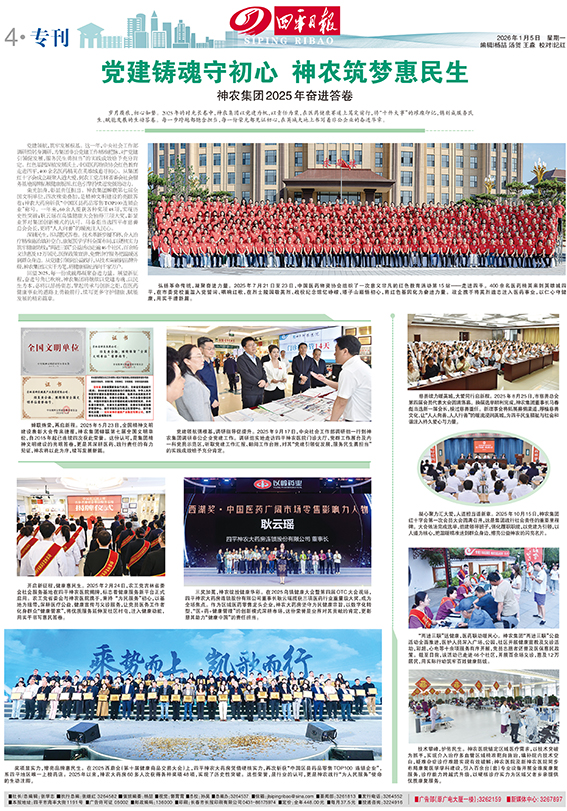 回望 2025,每一份成就都凝聚奋进力量。展望新征程,奋进号角已吹响,神农集团将继续以党建为魂、以民生为本,必将以昂扬姿态,擎起传承与创新之炬,在医药健康事业的道路上勇毅前行,续写更多守护健康、赋能发展的精彩篇章。
